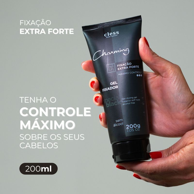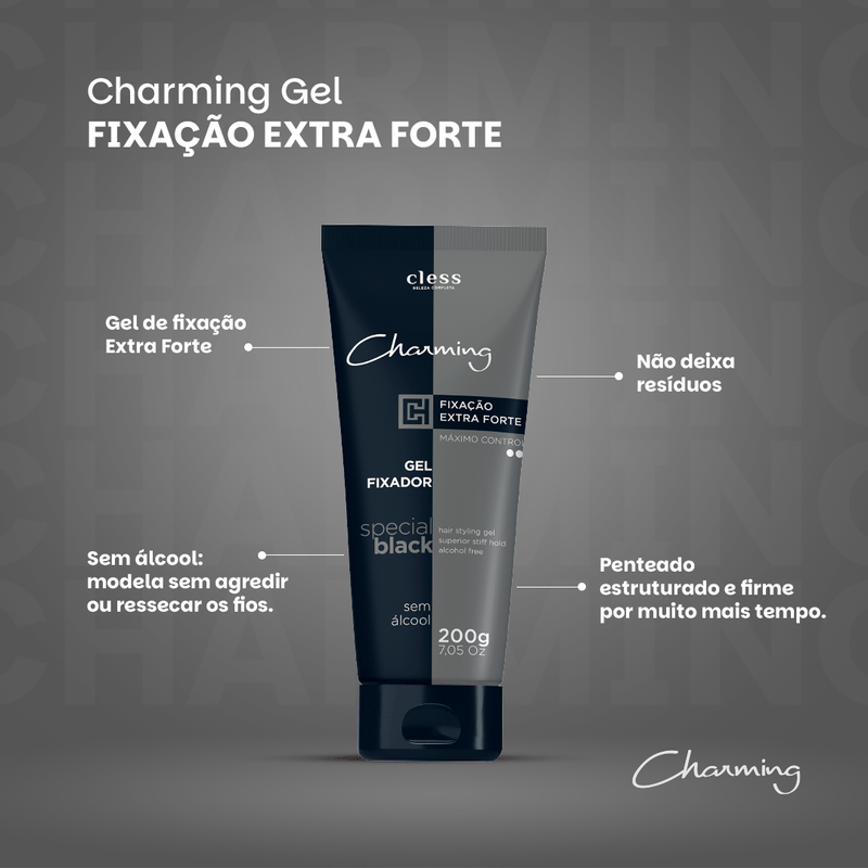 O gel fixador Charming Men tem longa duração, mantém o penteado por muito mais tempo, sem deixar resíduos. Não possui álcool em sua formulação, por isso não agride ou resseca os fios.