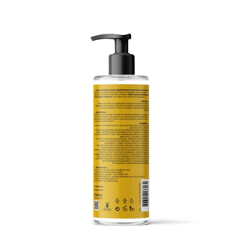 Loção Desodorante Hidratante Corporal Eu Amo Charming Nozes e Karité. Esta loção oferece o que há de mais moderno em hidratação, deixando a pele com um