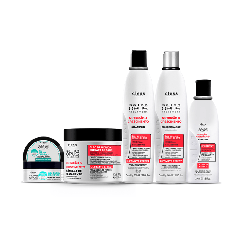 O cuidado completo que seus cabelos merecem! O Kit Salon Opus Nutrição & Crescimento + Óleo de Coco foi desenvolvido para tratar profundamente cabelos fracos, ressecados ou com crescimento comprometido. Composto por shampoo, condicionador, máscara de tratamento, leave-in e óleo de coco, esse kit oferece uma rotina completa de nutrição, força e brilho.