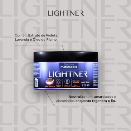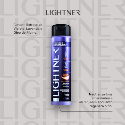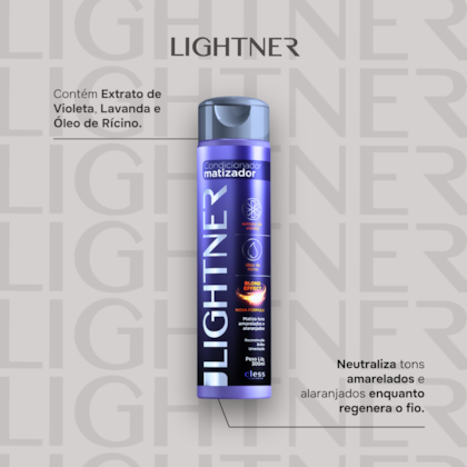O Condicionador Matizador Lightner complementa o tratamento, promovendo hidratação, brilho e reconstrução. Com óleo de rícino e extrato de violeta, auxilia no alinhamento das cutículas, intensifica o efeito platinado e deixa os cabelos mais sedosos e fáceis de pentear.