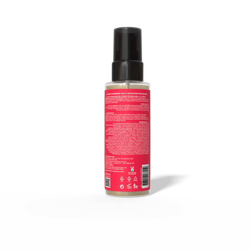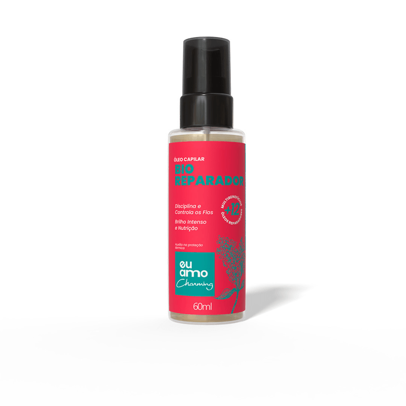 Óleo Capilar Biphasic Reparador Eu Amo Charming. Este tratamento multifuncional oferece 12 benefícios de reparação para o fio, combinando a eficácia do óleo e o poder da fase aquosa.