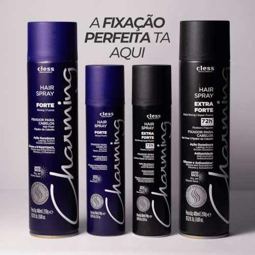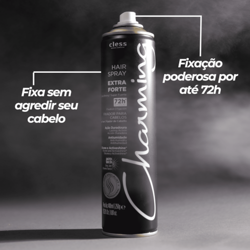 O Hair Spray Charming Extra forte é indispensável na bancada dos profissionais de cabelo. Oferece jato seco, fixação prolongada e duradoura. Ideal para texturização, montagem e finalização para penteados mais elaborados em diferentes tipos de cabelos.