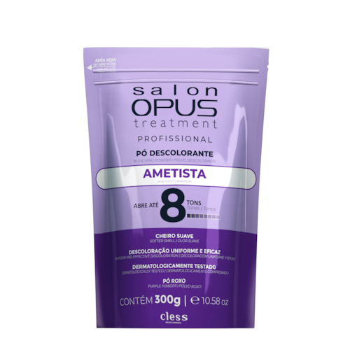 SALON OPUS PROFISSIONAL PÓ DESCOLORANTE AMETISTA foi desenvolvido para clarear os cabelos até 8 tons. Sua ação gradativa garante uma descoloração uniforme e eficaz, que auxilia a neutralizar tons amarelados, mantendo os cabelos bonitos e saudáveis. COMO USAR: SIGA RIGOROSAMENTE AS INSTRUÇÕES DE USO E FAÇA A PROVA DE TOQUE E DE MECHA ANTES DE APLICAR O PRODUTO. Despeje o Pó Descolorante Salon Opus em um recipiente não metálico e adicione aos poucos a Água Oxigenada Salon Opus. Para 1 medida de Pó Descolorante Salon Opus, utilize 2 medidas de Água Oxigenada Salon Opus. Misture com uma espátula não metálica até formar um creme homogêneo e aplique sobre os cabelos secos. Deixe agir de 10 a 45 minutos no máximo, conforme o grau de clareamento desejado, estrutura, porosidade e cor base do cabelo. Caso necessário, reaplique o produto até obter o grau de clareamento desejado, conforme a saúde dos fios. Não se exponha ao sol durante a aplicação. Enxágue com água morna e lave os cabelos com shampoo e condicionador para a remoção total do produto. Recomendações de volumagem: 10 volumes – clareamento de pelos. 20 volumes – clareia de 2 a 3 tons. 30 volumes – clareia 3 a 5 tons. 40 volumes – clareia de 6 a 8 tons. PROVA DE TOQUE: Prepare um pouco de produto e aplique no antebraço ou atrás da orelha e deixe agir pelo tempo de ação indicado. Em seguida lave o local e aguarde 24 horas, caso surjam sintomas de enjoos, irritações, ardência ou vermelhidão no local aplicado, ou proximidades, fica comprovado a hipersensibilidade ao produto e, portanto, o mesmo não deve ser utilizado. TESTE DE MECHA: Prepare uma pequena quantidade do produto e aplique em uma mecha no alto da cabeça, deixando o tempo de ação indicado e depois lave os cabelos. Caso o cabelo apresente quebra, elasticidade ou aquecimento durante a aplicação, o produto não deverá ser utilizado. ADVERTÊNCIAS: CUIDADO! Contém substâncias passíveis de causar irritação na pele de determinadas pessoas. Pode causar reação alérgica. Fazer a Prova de Toque antes de aplicar. Este produto somente deve ser utilizado para o fim a que se destina, sendo perigoso qualquer outro emprego. Não usar em cílios e sobrancelhas. Não utilizar antes ou após qualquer tipo de tratamento químico, tais como tintura, progressiva à base de sais metálicos, permanente ou alisamento. Conservar o produto em local fresco e ao abrigo da luz e calor. Após o uso, lacre-o bem, pois o manter aberto pode reduzir a eficácia do produto. Não reaproveitar a embalagem. Não se recomenda o uso ou a aplicação deste produto em gestantes. O produto é impróprio para o uso em crianças. Não aplique o produto se o couro cabeludo ou a pele apresentar lesões, ou irritações. Não ultrapassar o tempo de aplicação indicado. Em caso de irritação da pele, lavá-la abundantemente com água e evitar exposição ao sol. Caso o produto caia nos olhos, lave imediatamente com água em abundância até o remover completamente e procure um médico. Não se expor ao sol durante a aplicação. Mantenha o produto fora do alcance das crianças. O uso indevido deste pode causar danos no organismo em geral. Recomenda-se o uso de luvas adequadas. Contém amônia. INGREDIENTES | INGREDIENTS: sodium silicate/silicato de sódio, talc/talco, ammonium persulfate/persulfato de amônio, potassium persulfate/persulfato de potássio, hydrated silica/sílica coloidal hidratada, hydroxyethylcellulose/hietelose, xanthan gum /goma xantana, ci77007/corante azul ci77007, dolomite/dolomita, magnesium carbonate/carbonato de magnésio, aqua/água, tetrasodium edta/edetato dissódico, amethyst powder/ametista em pó.